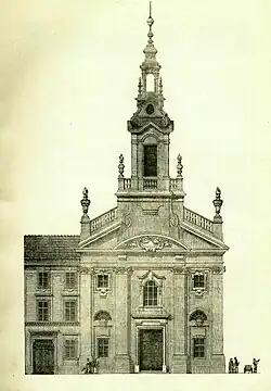 Construction work began on 8 August 1887.[14] The exterior was entirely transformed into the neo-Baroque style, making the Reformed prayer house the first Protestant church in Vienna to feature a church tower.[15] Sowinski also added a new main portal to the neo-Baroque façade facing Dorotheergasse.[14] Neo-Baroque, theoretically supported by art historian Albert Ilg,[16] increasingly became recognized as an Austrian "national style" in the 1880s.[13] The side façade facing Stallburggasse was also redesigned.