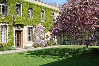 In 1927, the main portion of the site was purchased and the buildings, including various farm buildings and two wells in Pusey Street, were secured shortly afterwards from St John's College. The college appointed T Harold Hughes (1897–1949) as the architect for the site. Hughes was responsible for much extension and restoration work in Oxford, including Exeter College, Hertford College and Corpus Christi College.[10] The first four students arrived in 1928. At this time, many of the classes were held at Mansfield College and other lectures were held at various other colleges. However, as early as 1924, Wheeler Robinson started to promote his plans for a new building scheme on the Oxford site to former students. Between 1935 and 1938, he and E. A. Payne spoke at various meetings and raised £20,000 of the £50,000 needed for the project.[11] The foundation stones for Helwys Hall were laid on 21 July 1938, by representatives from the Baptist Union of Great Britain and Ireland, the Particular Baptist Fund, and the Baptist Missionary Society. Stones were also laid in memory of Angus and Gould, former principals of the college.