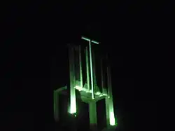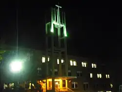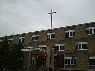 For 47 years, the school featured a large bell tower in the front of the school which displayed a cross, which was illuminated nightly. A piece of the tower fell off in November 2010 and the tower had to be taken down for safety concerns. By March 1, 2011, the tower had been completely dismantled, and the cross was replaced atop the roof of the Central Section of the Main Building.