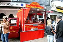 Bavarian Fleischkäse (also called Leberkäse), is similar to meatloaf, sliced to the thickness of a finger and generally served with either hot mustard or sweet mustard in a roll. Germany is also known for its various types of sausage, as well as the recent hybrid curry-sausage, currywurst. French fries (pommes in German, derived from French but pronounced according to German orthographic rules) are popular, served with ketchup and/or mayonnaise, and sometimes with sausage. In northern Germany rolls with pickled or smoked fish (e.g. matjes) are also a common snack, occasionally sold out of mobile smoke houses. Beer is sold at all sidewalk snack stands, which usually feature beers and small bottles of whiskey, schnapps, or vodka.