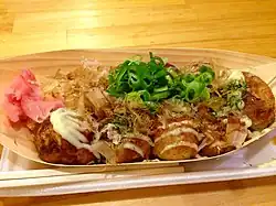 The most popular and well-known street food in Japan is takoyaki, consisting of fried batter filled with octopus, onions, ginger, and tempura pieces. Traditionally, it is cooked in an iron pan with round holes to create the shape of a takoyaki and it comes in a shape of a ball with fish shaving and sauce. This dish originated from Osaka.[27] The custom of street food is not to eat in the streets because of tradition. It is more acceptable to eat sitting under a roof, at home, or designated eating area.[28]