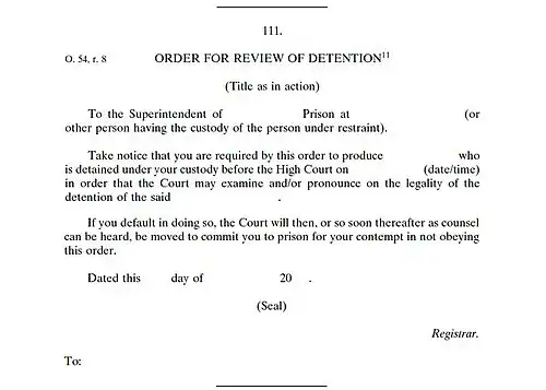 An order for review of detention directs someone holding a person in detention to produce the detainee before the High Court so that the legality of the detention can be established. In Re Onkar Shrian (1969),[55] the High Court held:[56]