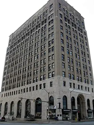 Shortly after the passage of the National Bank Act by Congress in 1864, several banks were chartered in Erie. One of these, Dime Savings and Loan, was founded in 1866; it was reorganized as the Erie Trust Company in 1902.[11] The economic boom following World War I set off a flurry of building activity in downtown Erie, including a ten-story skyscraper at 12th and State Streets. By the mid-1920s, the Erie Trust Company had become the dominant banking institution in the city and needed space to expand.[12] The bank hired the New York City-architectural firm Dennison and Hirons in 1925 to design its new headquarters—the firm also designed the Home Savings Bank Building in Albany, New York. The Erie Trust Company Building was completed in 1928 at a cost of $2 million. A year later, the stock market crashed sparking the Great Depression, and, by 1933, the Erie Trust Company went bankrupt.[12] Its remnants and that of another defunct bank were reorganized into the National Bank and Trust, which continued to occupy its former headquarters now owned by the Commonwealth of Pennsylvania.[13]