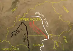 The colours of the national flag corresponded to the names of the Volta's three main tributaries: the Black Volta, the White Volta and the Red Volta.[11]