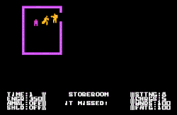 The playfield is presented as a top-down view of the current location of the hero. The game is turn-based, with the player given a certain number of "points" to spend on various actions, completing their turn when the points ran out. Rescue at Rigel is very similar to Temple of Apshai, a popular dungeon crawl by Epyx, part of their "Dunjonquest" series. Rescue at Rigel had a timer similar to The Datestones of Ryn, an earlier Dunjonquest game.