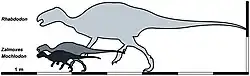 Traditionally, it has been thought Mochlodon and Zalmoxes were insular dwarfs. The smaller sizes of Mochlodon (1.6 to 1.8 m) and Zalmoxes (2.0 to 2.5 m) relative to Rhabdodon (5.0 to 6.0 m)[6] and the island locale that all three genera shared led to the hypothesis of island nanism in the case of the former two. However, Ősi et al. (2012) proposed that Rhabdodon underwent gigantism on the mainland, as opposed to Zalmoxes and Mochlodon experiencing nanism on island habitats.[3] Ösi and colleagues used femur length to estimate body size through evolution in the rhabdodontid lineage. The conclusion was that in the eastern lineage comprising Zalmoxes and Mochlodon, the size ranges of both were too close to that of the ancestral rhabdodontid to support the hypothesis of nanism. Ösi and colleagues instead came to the conclusion that Rhabdodon in the western lineage is a case of gigantism in the group Rhabdodontidae.[3]