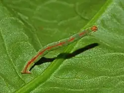 The caterpillars mimic twigs and therefore they are quite difficult to locate. They are slender and reach a length of about 25 millimetres. The basic colour is pale brown or green, with a whitish underside. The green forms usually show a dark brown or reddish irregular stripe on the back. The head is reddish brown and relatively small.