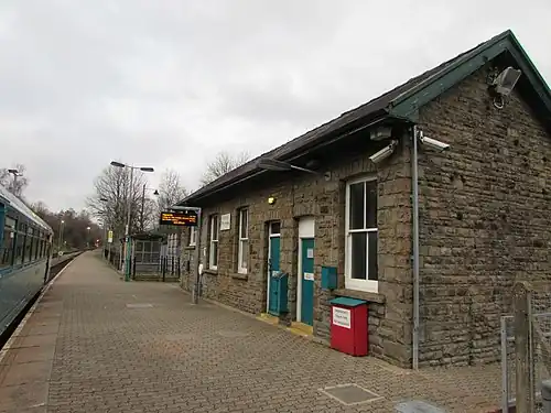 Rhymney railway station serves the town of Rhymney in Wales. Situated on the Valley Lines network 23 miles (37 km) north of Cardiff Central, it is the terminus of the Rhymney Line. The station has sidings to the west of its single platform which are used for the overnight stabling of the diesel multiple unit trains.