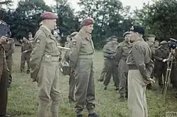 In May 1943, Gale was promoted to the acting rank of major-general and became GOC of the newly formed 6th Airborne Division.[41][42][33][23] Gale had just under a year to organize and train the division before it was due to participate in Operation Tonga, codename for the British airborne landings in Normandy, in June 1944.[6] The division was initially understrength due to trained British airborne troops being transferred to North Africa and Sicily to replace the very heavy losses suffered by the 1st Airborne Division (now commanded by Hopkinson who had succeeded Browning) during its operations, but it was soon expanded with the arrival of the 1st Canadian Parachute Battalion, joining the 3rd Parachute Brigade, under Brigadier James Hill, as well as the formation of the 5th Parachute Brigade, under Brigadier Nigel Poett, and the 6th Airlanding Brigade, under Brigadier Hugh Kindersley.[43][33] No British airborne division had ever been deployed into battle entirely through aerial means, and devising plans and formulating tactics for the operation placed a great deal of pressure on Gale.[2][43]