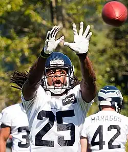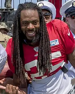 Richard Kevin Sherman[1] (born March 30, 1988) is an American former professional football cornerback who played 11 seasons in the National Football League (NFL). Sherman played college football for the Stanford Cardinal, beginning his career as a wide receiver before moving to cornerback as a junior.[2] He was selected by the Seattle Seahawks in the fifth round of the 2011 NFL draft. He was selected to the Pro Bowl five times and voted All-Pro five times, including three times to the first team, and led the NFL in interceptions in 2013, when he also helped the Seahawks win their first Super Bowl. Sherman is considered one of the greatest cornerbacks of all time.[3][4]