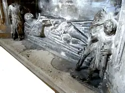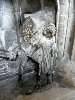 Sir Richard was also buried in Exeter Cathedral, near his brother the bishop, against the north wall across the north ambulatory from the bishop's tomb. His tomb is marked by an elaborate monument comprising a recessed ogee shaped niche set into the wall, containing his recumbent effigy, in the form of a cross-legged knight, which style supposedly represents crusaders. At the effigy's head stands a small statue of a man and at the feet a horse with an even smaller statue of a man holding its reins. According to Prince (d. 1723)[17] this last group refers to the tradition of the cripple who seised the foreleg of Sir Richard's horse at Cripplegate and thereby threw him off his horse into the hands of the murderous mob. It is however more likely that the figures are "a touching early fourteenth century visual representation of the Knight with his immediate following ... a knight is shown accompanied by his squire, page and horse".[18] The Devon historian Sir William Pole (d. 1635) stated that the arms of Stapledon (Argent, two bends wavy sable) were displayed on the shield of the effigy,[19] but today no trace of colour remains. These arms are however still visible (possibly restored) on the nearby monument to his brother the bishop.