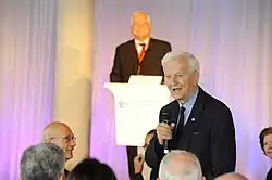 Weizsäcker's speech was praised both nationally and internationally.[58] The New York Times called it a "sober message of hope to the uneasy generations of young West Germans".[55] The president of the Central Council of Jews in Germany, Werner Nachmann, thanked Weizsäcker for his strong words,[59] as did Karl Ibach, a former member of the German Resistance, who called his speech a "moment of glory (Sternstunde) of our republic".[60] Weizsäcker was however criticized for some of his remarks by members of his own party. Lorenz Niegel, a politician of the sister party CSU, who had not taken part in the ceremony, objected to the term "day of liberation", referring to it instead as a "day of deepest humiliation".[61] The Greens were also absent during the speech, choosing instead to visit Auschwitz.[61] A year later, the Green politician Petra Kelly called the speech "correct, but not more than self-evident", pointing to speeches president Gustav Heinemann had made during his presidency.[62] The harshest criticism came from the Federation of Expellees, whose president Herbert Czaja, while thanking the president for highlighting the expellees' fate,[63] criticized his remark that "conflicting legal claims must be subordinated under the imperative of reconciliation".[64]