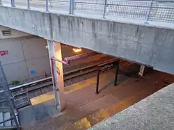 There are no turnstiles at this station. It is served by a one-track wye which extends from St. George to the southern (geographically eastern) trackway of the station's island platform. Bumper blocks are present at the end of the station, though the wye continues to the end of the ballpark parking lot where it ends at a second set of bumper blocks. This section originally was electrified but is no longer powered. After the abandonment of the station, the sole track is used to store locomotives. The northern trackway currently has no track and is unused.[7]