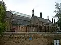 The line crossed the River Swale at Easby, and terminated in the Parish of St Martin's on the south bank of the Swale opposite the town of Richmond, as it was considered "geographically impossible" to build the railway into the town.[4] The station layout consisted of two platforms for passenger trains, one which ended in a horse-loading dock, and the other was underneath the main trainshed.[5] Generous facilities were provided for goods traffic, together with facilities for railway operations and staff accommodation. The principal features were: