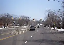 Most of Ridge Road between Lewiston and the city of Rochester 70 miles (113 km) to the east passes through rural, outlying areas of Niagara, Orleans, and western Monroe counties. While NY 31, a parallel highway 5 miles (8 km) to the south, passes through most of the region's largest communities—including the city of Lockport and the villages of Medina, Albion, and Brockport—Ridge Road and NY 104 bypass them entirely. Instead, the two-lane road passes through only small hamlets built up around junctions between NY 104 and other state routes.[5] This changes in central Monroe County, however, where Ridge Road (known locally as West Ridge Road) is six to nine lanes wide[6] as it serves as the backbone of a large commercial district in the town of Greece.[7] Once in Rochester, West Ridge Road enters areas more residential and industrial in nature, including the sprawling Eastman Business Park near the Genesee River.[8]