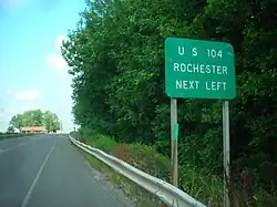 Beginning in the 1940s, US 104 began to be moved from Ridge Road to expressways and super two highways constructed to bypass the numerous communities that had developed along Ridge Road east of Rochester. The first portion of the super two, extending from the Monroe–Wayne county line at Union Hill to west of Sodus, was opened to traffic in the mid-1940s.[35][36] An extension of the highway around Sodus to NY 414 in Huron was built in the mid-1960s, resulting in US 104 being temporarily routed on Lake Bluff Road in between the end of the super two and Ridge Road.[15][37] The remainder of the super two between Huron and Red Creek was finished in the early 1970s.[38][39] In place of US 104, Ridge Road in Wayne County was designated as CR 103 west of NY 88,[11][12] CR 143 between Sodus and Wolcott,[12][14] and CR 163 from Wolcott to NY 370.[14][16]