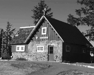 After the war, the Army Corps of Engineers built several hiking trails radiating out from the lodge area. This allowed park visitors to make day-trip to Watchman Peak on the west rim and Garfield Peak on the south rim, and return to the lodge by evening.[3] In 1921, Fred Kiser was given permission to construct a stone building near the edge of the rim where he could sell his hand colored photographs of Crater Lake.[7] By 1924, a number of amenities were available in the "Village" area. These included the lodge, a public campground, Kiser's studio, a park community center for special programs, and public comfort stations.[3]