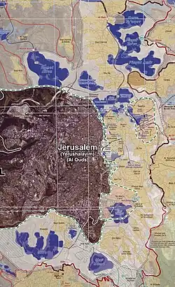 - ^ A Palestinian Academic Society for the Study of International Affairs study notes (citing from another analysis) that "'since 1967, two rings of new residential neighborhoods built around the city center have created new ramparts [emphasis original] designed primarily as a political barrier against any possible repatriation of the city.'" And concludes that: "the strategic placement of these four settlements formed the key links of the inner ring of settlements between East Jerusalem and the West Bank. Passia.org Archived 2007-10-26 at the Wayback Machine