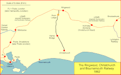The Ringwood, Christchurch and Bournemouth Railway (RC&BR) was a railway company formed to link Christchurch and Bournemouth, England, to the London and South Western Railway's Southampton and Dorchester line at Ringwood. The RC&BR opened in 1862 from Christchurch to Ringwood, and was extended to Bournemouth in 1870, sharing in the growing popularity of the town. However the route was circuitous, and the London and South Western Railway opened a shorter route between Brockenhurst and Christchurch via Sway in 1888, making the Ringwood to Christchurch section a branch line.