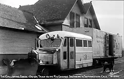 The Great Depression of 1929 heavily affected the RGS, to the point where the railroad could not afford to operate one single steam locomotive (Paying for Fuel, Paying the Engineer and Fireman to operate the locomotive, etc.). However, they still had the responsibility to ship US Mail, and in 1931, Chief Mechanic Jack Odenbaugh devised a way to construct seven homemade "railcars" that would be cheap to build and operate, capable of transporting US mail and a few passengers. The official names given from the RGS were "Motors", but these railcars would later be unofficially named "Galloping Geese" by Railfans because of how they looked, operated, and sounded.- Waddling down the poorly maintained, unlevel RGS tracks with a silver-painted body and hood covers that looked like goose wings when opened up to prevent the motor from over-heating, and the horn sounding somewhat like a honking goose. These railcars are arguably one of the most iconic aspects of the RGS and are known by most narrow-gauge railfans. The first Goose (RGS Motor #1) was built from a recycled Buick body, frame, and engine, and #2 would be as well, but with a larger and enclosed freight compartment, a requirement to haul US mail. Motors #3 through #5 and #7 were built from Pierce Arrow bodies, but with freight compartments the size of a boxcar. Motor #6 was made from a Buick as well, but it was designated for Maintenance of Way service, and only had a flatbed attached behind the cab. Later on, Motors #3 through #5 would receive replacement Wayne bus bodies. These motor cars indeed were successful and handled daily services until 1940 when the RGS could afford to run regular freight trains. Even after that, the Geese completely replaced revenue-generating passenger trains until abandonment; almost all passenger coaches the RGS owned at the time had been put into MOW service since.[4][5]