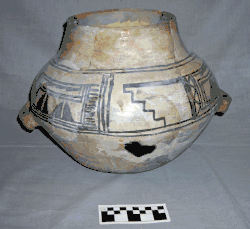 The Rio Grande white wares comprise multiple pottery traditions of the prehistoric Puebloan peoples of New Mexico. About AD 750, the beginning of the Pueblo I Era, after adhering to a different and widespread regional ceramic tradition (the Cibola White Ware tradition) for generations, potters of the Rio Grande region of New Mexico began developing distinctly local varieties of black-on-white pottery. This pottery involved the use of black mineral paint (mostly before AD 1200) or black vegetal paint (mostly after AD 1200) on a white, off-white, or light gray background. The black-on-white tradition finally died out about AD 1750.