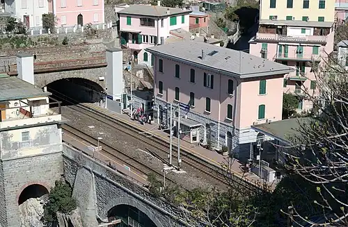 Double track between Manarola and Riomaggiore was opened in 1920 and extended on 14 November 1933 as far as the Gaggiola tunnel and between Riomaggiore and Corniglia on 31 May 1959.[3] Associated work in the station area included the construction of the portal of the Batternara-Riofinale tunnel with a polycentric arch, which required changes to the adjacent areas, and the construction of a new 2-storey passenger building, a goods warehouse with a loading dock and the current underpass.[4]