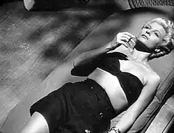 Her sexy, glamorous appeal was most noted in Charles Vidor's film noir Gilda (1946) with Glenn Ford, which caused censors some consternation. The role, in which Hayworth wore black satin and performed a legendary one-glove striptease, "Put The Blame On Mame", made her into a cultural icon as a femme fatale.[9]