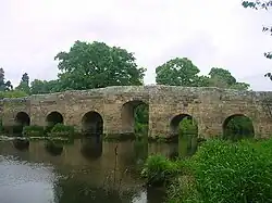 Continuing southwards, the river passes the gallops which are part of Coombelands Racing Stables, situated on the eastern bank,[31] and Park Mount, a motte and bailey dating from the time of the Norman conquest. It is one of the best-preserved monuments of this type in south east England.[34] The river is crossed by Stopham Bridge, a fine medieval stone bridge built in 1422–23. The centre arch was raised as part of the improvements made to the navigation in 1822. It is a Grade I listed structure, and also a Scheduled Ancient Monument. It was damaged by army lorries in the Second World War, but has been repaired,[35] and the heavy traffic on the A283 road was diverted onto a new bridge just upstream of it in the 1980s.