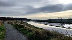 From Castle Park to Wivenhoe Railway Station, National Cycle Network Route 51 roughly follows the course of the Colne. This is a mixture of tarmac-surfaced shared-use paths, a short tarmac/gravel-surfaced area and, once out of the urban area of Colchester, a hard dirt path on the north levee of the river that passes the Hythe and the university all the way to Wivenhoe.