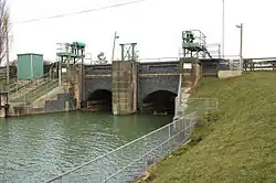 In 1734, John Grundy, one of the pioneers in applying scientific principles to the solution of civil engineering problems, was asked by the Adventurers of Deeping Fen to consider the drainage of 47 square miles (120 km2) of fenland to the west of Spalding. His plans included the construction of a reservoir which covered 10 acres (4.0 ha), impounded by a sluice at Surfleet. At low tide, the water would be released, and the scouring action would deepen the channel, with a consequent improvement in drainage. Humphrey Smith directed the construction, with Grundy acting as engineer, which was completed in 1739, according to a plaque fixed to it at the time. The sluice had three openings, each 8 feet (2.4 m) wide, with pointed doors on the downstream site, which closed as the tide rose, and lifting gates on the upstream side, which would be raised to discharge the water.[14] The present sluice was erected by the trustees of the Deeping Fen Drainage Act 1856. The first stone was laid by Lord Kesteven on 17th February 1879 and the sluice opened in November 1879 at a total cost of £15,000.
