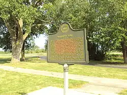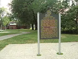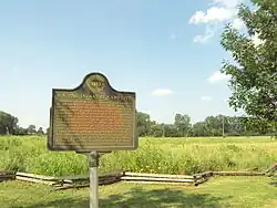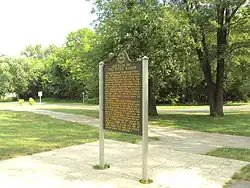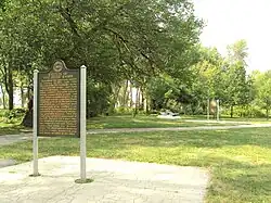 The River Raisin Battlefield Site was listed as a Michigan Historic Site on February 18, 1956, although the exact date at which the park was first organized is unknown. The location of the site is bounded by North Dixie Highway, the River Raisin, Detroit Avenue, and Mason Run Creek.[4][9] The Battle of Frenchtown is so named because it took place in and surrounding the Frenchtown Settlement (1784), on the River Raisin's north bank and within the present-day city limits of Monroe.[10] The area of conflict extended during the three days of battle several miles to the north and south of the current park site. After the battles, Frenchtown was gradually abandoned and the present-day city of Monroe developed from its downtown site 1.5 miles west and on the opposite bank of the River Raisin. The current park area encompasses some 40 acres (16 ha) of undeveloped land on Monroe's east side approximately one-quarter mile (0.4 km) west of Interstate 75. The area contains houses on the outer fringe along East Elm Avenue, and much of the area is occupied by urban development. The River Raisin Paper Company built a large paper mill on the site around 1911, which operated under multiple owners until 1995.[11]