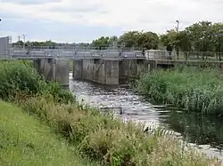 Some 20,000 people live in regions of Lincoln that are susceptible to flooding. Most of the city's industrial buildings and around half of the commercial property is also at a high risk from flooding.[11] There were major floods in the city in 1947 and 1958, and the amount of water delivered to the city by the River Till was a significant factor in the 1958 floods.[12] Following these events, feasibility studies were carried out in 1977 to identify ways to mitigate flooding in the city. This resulted in the construction of two washlands, one where the River Brant joins the River Witham, to the south of Lincoln, and the other on the River Till, to the north-west. Work began in 1984, and the two schemes can hold back 340 million cubic feet (9,600 Ml) of floodwater. In both cases, a shallow embankment was constructed across the river valley, and the river passes through a control sluice, which can be used to limit the volume of water travelling downstream. Inlet and outlet sluices in the embankments can be opened to allow the water to flood the Till washlands, rather than allowing river levels in the city to breach the defences.[7] The water from the washlands is subsequently released as levels through the city return to normal. Draining of the washlands is assisted by pumping stations, and the scheme was completed in 1991.[11]