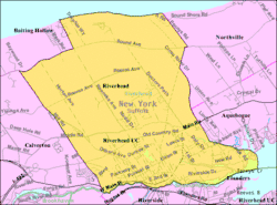 Situated at the mouth of the Peconic River, which empties into Peconic Bay where the North and South Forks of Long Island split, the town of Riverhead (of which the CDP is a part) is the official county seat of Suffolk County. In the 1960s, most of the county offices moved to the CDP of Hauppauge in the towns of Islip and Smithtown in the more populous western half of the county—a move which still spurs attempts for the town of Riverhead to lead the way for the secession of eastern Long Island towns to form Peconic County.