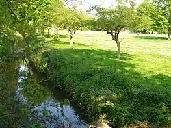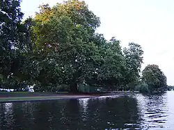 The island is a meadow lightly covered with trees with dense patches, shrubbery and reeds at each end. The former common land meadow is publicly open and Metropolitan Green Belt.[1] It is a long area of open riverside on the side of the river opposite the Thames Path — from here the point of Sunbury Lock Island can be seen. It is connected to the bank by an elegant arched footbridge with simple metal balustrades and separate painted round handrails and in dry periods four-wheel vehicle access is possible via a ford of the narrow backwater separating it from the land. Rivermead was originally two islands, the much smaller, downstream part being Swan's Rest, since the late 20th century completely joined, remaining part of Elmbridge as its fishing rights were anciently conferred to the parish south of the river.[2]