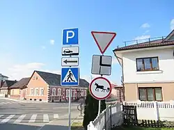 Road signs in Belarus are regulated by the road sign standard STB 1140-2013.[1] Due to the country being a former Soviet Socialist Republic between 1920 and 1991, road signs are similar in design to those used in the Soviet Union before its dissolution in 1991, as well as in most other post-Soviet states, especially neighboring Russia, Ukraine, and Lithuania. Like Russia and Ukraine, Belarus is a signatory to the Vienna Convention on Road Traffic and the Vienna Convention on Road Signs and Signals.[2] Belarus signed the Vienna Convention on 8 November 1968 and ratified it on 18 June 1974, when the country was a Soviet Socialist Republic.[3] The Soviet Union itself was once a signatory to the Vienna Convention on Road Signs and Signals.[4]