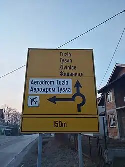 Road signs in Bosnia and Herzegovina do not differ much from the rest of Europe, such as Croatia, Slovenia, Serbia and North Macedonia. Ministry of Transportation of Bosnia and Herzegovina regulates them. Bosnian and Herzegovinan road signs have two scripts, Latin and Cyrillic script.