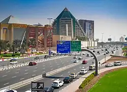 Road signs in United Arab Emirates are modelled on the British road sign system[1] that are regulated by the Road Traffic Authority (RTA) Dubai and Department of Transport (DoT) Abu Dhabi. The English language typeface is Transport and the Arabic language typeface is Naskh.[2]
