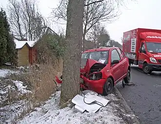 If the vehicle strikes a fixed object (an object that will move very little when struck, such as a tree, bridge structure or utility pole) or rolls over, the crash is likely to result in injuries or fatalities. US statistics for 2005 show that roadway departure crashes resulted in 31% of fatal crashes, but were only 16% of all crashes.[4] Roadway departure collisions where the vehicle is sliding or spinning and runs broadside into a fixed obstacle are particularly dangerous since the vehicle doors and sides provide less protection to occupants than the front of the car.