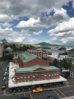 The district's history dates to 1882, when the Norfolk and Western Railway (N&W) began the process of locating its headquarters to the small town of Big Lick.[4] That decision precipitated a name change for the town to Roanoke, as well as a migration of the town's business district southeast towards the new railroad depot and hotel being built by the N&W.[4] A town square along Campbell Avenue began seeing use as a makeshift open-air market, and in 1884 the new City of Roanoke's original charter provided for the construction of a municipal market.[5][6] Completed in 1886, the original market building occupied the northwestern portion of the square; when that building was destroyed by fire it was replaced in 1922 with the current building and its centered arrangement.[5][7]