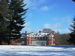 Architect John Borie designed this Colonial Revival style brick house built in 1903 as the residence of the head gardener.[53] Its masonry exterior is composed of the same materials used in Allerton House, also designed by Borie. Today it stands at what originally was the end of the public road leading to Allerton's private grounds. After an exchange of lands, this road was no longer a public thoroughfare. When the estate became a public park the road was reopened as a county road (C.R. 1400N-575E) called Old Timber Road.