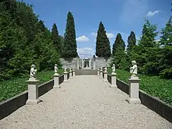 Allerton Park's gardens consist of a one-quarter-mile-long (0.40 km) formal garden, and a one-and-a-quarter-mile-long (2.0 km) sculpture walk extending westward from the end of the formal garden. The gardens incorporate many pieces of sculpture and ornaments.[15]