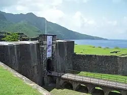 At the end of May 1691 the English under Christopher Codrington, who had taken Marie-Galante, appeared off Guadeloupe.[5] Governor Hincelin was suffering from severe hydropsy, which limited his mobility, and retired into the interior. 400 men under La Malmaison as king's lieutenant delayed the English for a day before being forced back.[6] The French troops retreated into Fort Saint-Charles(fr) and were besieged there by the English.[3] La Malmaison led the resistance of the fort at Basse-Terre for 36 days, when d'Eragny arrived in Guadeloupe with a force of buccaneers and other troops, at which Codrington hastily reembarked leaving behind cannons and some of his wounded.[7]