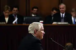 Gates was nominated by Republican president George W. Bush as secretary of defense in 2006, replacing Donald Rumsfeld.[3] He was confirmed with bipartisan support.[4] In 2007, Time named Gates one of the year's most influential people.[4] In 2008, Gates was named one of America's Best Leaders by U.S. News & World Report.[5] He continued to serve as secretary of defense in President Barack Obama's administration[6] and retired in 2011. "He'll be remembered for making us aware of the danger of over-reliance on military intervention as an instrument of American foreign policy," said former senator David L. Boren.[7] Gates was presented the Presidential Medal of Freedom, the nation's highest civilian award, by President Obama during his retirement ceremony.[8]