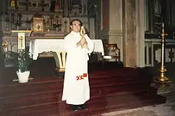 Before attending school, Fox was encouraged by his mother to study to become a priest like their local pastor Fr. William O'Meara. Fox stated that his "mother put the thought in my mind" of joining the priesthood before the first grade, "She mentioned it only two times in my life, but it stuck."[3] He recalled going with her to town when she would buy groceries and that she left him free for an hour and he "would go [to] the Catholic Church and genuflect and spend time before Jesus. Even then I could feel the Real Presence of Jesus in the tabernacle. That drew me to the priest-hood."[3]
