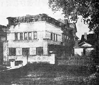 The simple, boxy shape of the Lamp House was quite modern for its time and stands as a precursor of Wright's breakthrough to abstraction by 1905. Together with the contemporaneous Dana–Thomas and William E. Martin Houses, it marks a transition between the styles of the Chicago School and the Prairie School. Contemporaries dubbed it "New American" in design,[5] while the casement windows were "Old English" in inspiration. Some elements, including the fussy, diamond-shaped ornamentation in the brickwork and the truncated corner piers rising to the height of the second-story window sills, have been attributed to Wright's draftsman Walter Burley Griffin.[5] Massive corner piers are a hallmark of Wright's nearly contemporaneous Larkin Building (1904) in Buffalo, New York. The exterior walls are constructed not of house brick but of cream-colored commercial brick, which Wright also used for his own home (1895) and studio (1898) in Oak Park, Illinois. The Lamp House's diamond-paned windows with frames painted a dark brownish red also echo those of Wright's Oak Park home and studio, which Lamp visited many times. At some time after Lamp's death, the building was painted white.