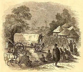 Eager to have his manuscript printed and distributed, Moffat embarked for Cape Town to have it printed, traveling in a covered wagon pulled by oxen. With him on the journey was his wife Mary and their two young daughters, Mary and Ann, ages nine and seven respectively, who were to be placed in school in Salem, Grahamstown upon their arrival to the cape.[32][33] At Grahamstown, however, he was met with disappointment when he was informed that there was no printer or ship for transport at Algoa Bay. Having no other recourse, he set off to Cape Town, some four-hundred miles east. The Committee of the London Bible Society had forwarded a letter of introduction to Cape Town informing them of Moffat's expectations upon his arrival.[16] Moffat arrived at Cape Town on October 30 and searched far and wide for a printing press with great difficulty. He was thus forced to plead with the governor, Galbraith Lowry Cole,[34] for help and possible use of the government's printing press, which was poorly equipped with only one competent printer, Mr. Van der Zant, at hand. Moffat received the funds necessary for paper and printing from the Bible Society. Having completed this arduous task, Moffat had acquired a working knowledge of printing in the process. An impressed John Philips saw the potential in Moffat and the prospect of having the entire Bible printed and distributed in the colony and he promised him an iron printing press, which had just arrived at Cape Town, to be taken back to Kuruman for that purpose. Moffat saw this as the crowning achievement to his effort in having the Bible translated and printed.[35][36]