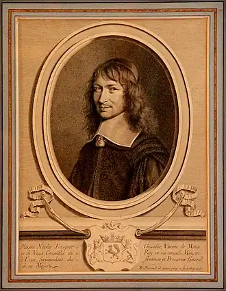 His crayon drawings and engraved portraits having attracted attention, by 1652 his work was in high demand.[3] By 1657 he was pensioned by Louis XIV and appointed designer and engraver of the king's cabinet.[5][6] It was mainly due to his influence that the king granted the edict of 1660, dated from Saint-Jean-de-Luz, by which engraving was pronounced free and distinct from the mechanical arts, and its practitioners were declared entitled to the privileges of other artists. Nanteuil's clientele included the Sun King himself, Cardinal Richelieu, Queen Christina of Sweden and many other high-ranking aristocrats and personages of note. Among the finest works of his fully developed period may be named the portraits of Pompone de Bellièvre, Gilles Ménage, Louis, Grand Condé, Jean Loret, the Duc de La Meilleraye and the Duchesse de Nemours.[5]