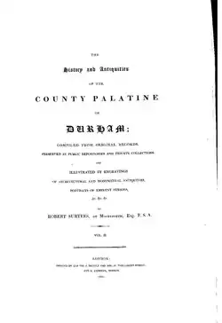 By 1816, the first volume of The History and Antiquities of the County Palatine of Durham was published ("compiled from original records preserved in public repositories and private collections by Robert Surtees"). Two further volumes followed and a final volume was published posthumously in 1840.[8] The work covers much of the county but does not include Weardale, Teesdale, the Aucklands, Brancepeth, or Durham Castle or Cathedral. James Raine compiled The History and Antiquities of North Durham (2 vols, 1830 and 1852) to supply the need.[9]