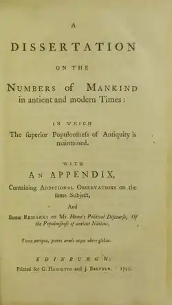 Wallace published in 1753 a Dissertation on the Numbers of Mankind in Ancient and Modern Times. It contained criticism of the chapter on the Populousness of Ancient Nations in David Hume's Political Discourses. The work was translated into French under the supervision of Montesquieu, and it was republished in an English edition with a memoir in 1809. In 1758 appeared Wallace's Characteristics of the Present State of Great Britain. In Various Prospects of Mankind, Nature, and Providence (1761), he recurred to his population theories, and was believed (by William Hazlitt and Thomas Noon Talfourd) to have influenced Thomas Malthus.[2]