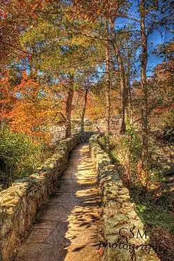 Rock City features a 4100-foot walking[4] trail lined with gardens containing hundreds of labelled local trees and plants. The trail also leads through a variety of unique and bizarre rock formations, including the 1,000 short tons (910 t) Balanced Rock and Fat Man's Squeeze. Two other sections, the Fairyland Caverns and Mother Goose Village, are rock caves decorated with blacklight-responsive sculptures. Other attractions include Standing Stone Gardens, Rainbow Hall, Swing-a-long Bridge, Stone Bridge, Cave of the Winds, Sky Bridge, Needle's Eye, and Goblin's Underpass.[5]